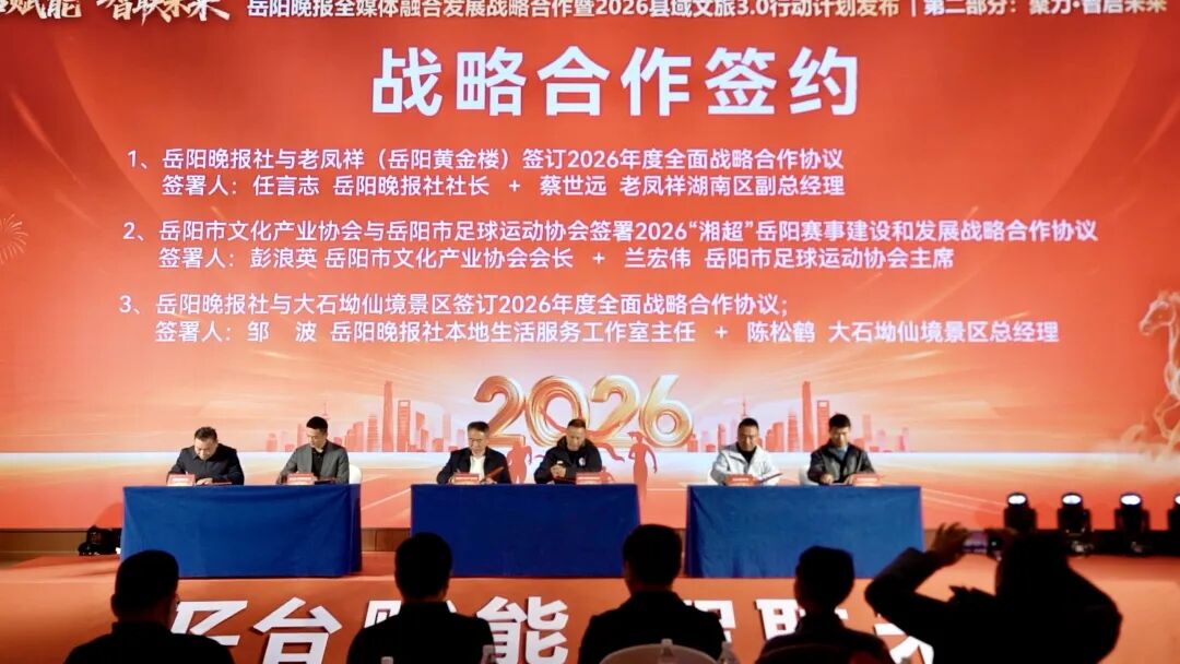 发布会现场,战略合作签约环节亮点纷呈,彰显媒体与产业的携手共赢。岳阳晚报社社长任言志与老凤祥湖南区副总经理蔡世远签订2026年度全面战略合作协议;岳阳市文化产业协会会长彭浪英与岳阳市足球运动协会主席兰宏伟,就2026“湘超”岳阳赛事建设和发展达成战略合作;岳阳晚报社本地生活服务工作室主任邹波与大石坳仙境景区总经理陈松鹤签署年度合作协议。此次集中签约,是报社近两年与五十余家市场化企业成功合作的延续,将进一步拓宽媒体服务边界,构建多方共赢的产业生态。