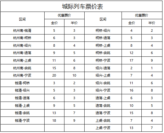 2.浙江省内70周岁及以上老年人乘车时,可享受半价优惠;注册在杭州绍兴宁波三地的全日制大、中、小学校的在校学生及1.2-1.5(含)米儿童享受半价优惠。