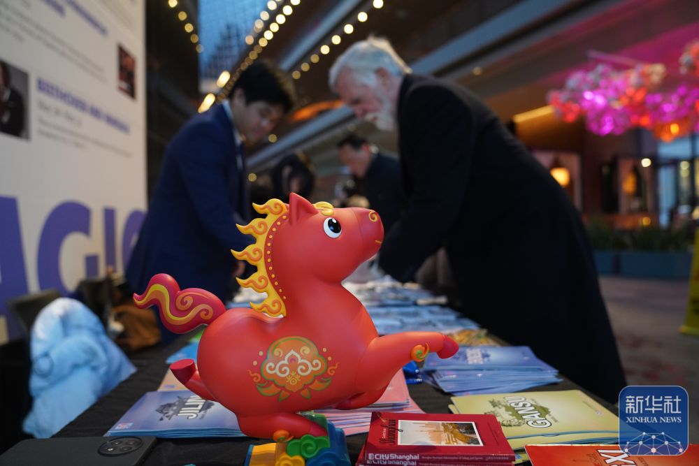 ↑1月28日,在美国费城,吉祥物幸运马摆放在“你好!中国”旅游推介系列活动签到处。