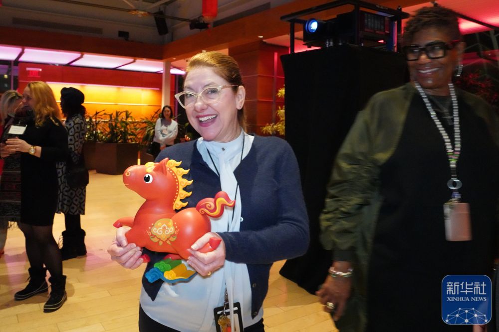 ↑1月28日,在美国费城,一名女子在“你好!中国”旅游推介系列活动上展示吉祥物幸运马。