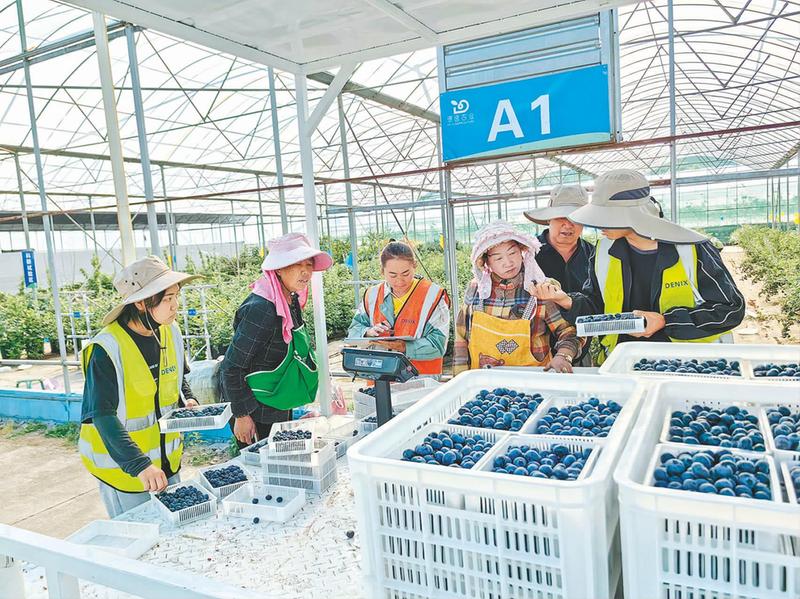 工人对刚采摘的蓝莓进行称重、装箱。