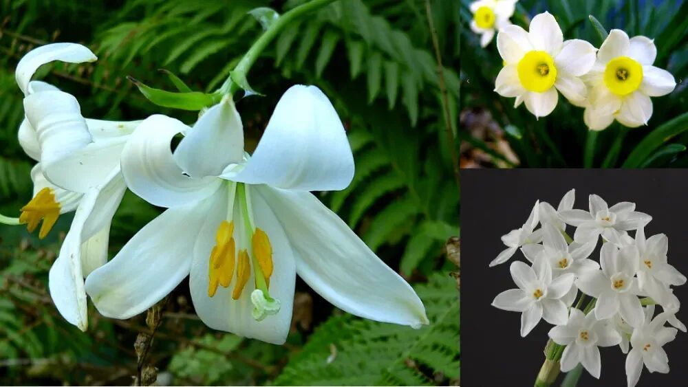 百合的典型花形(左侧大图)与水仙的典型花形(右侧两张小图)对比(wiki)