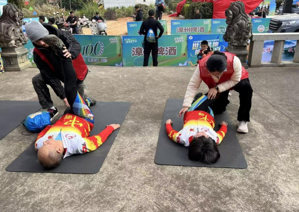 专业赋能“强内核”,构建运动康复服务新生态。依托中医与康复学院专业优势,实践队特邀科技特派员牵头技术指导,联合专业带头人统筹服务方案设计,搭配经验丰富的专业老师现场实操带教,三方协同在“华安福养驿站”搭建“巧手舒筋”工作站。针对山地自行车运动下肢负荷大的特点,运用中医推拿、筋膜放松等专业技能,为60余名完赛选手提供定制化康复服务,配套示范简易拉伸动作,构建“运动—康复—养生”全链条服务体系,服务满意度达100%。这一举措不仅将课堂专业知识转化为切实服务能力,更以专业力量提升体育赛事品质,展现了高校学科建设与社会实践的深度融合,为医旅赛事增值赋能树立了高校样板。
