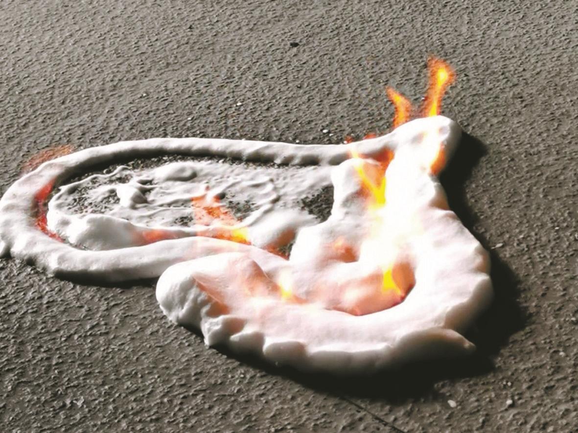 然而,这类被许多网友称为“浪漫神器”的产品,由于其易燃性,极易引发火情。实验现场,消防员用雪花喷雾在地上喷出爱心图样,待喷雾稍作凝固(约60秒)后,手持长柄打火机靠近点火。