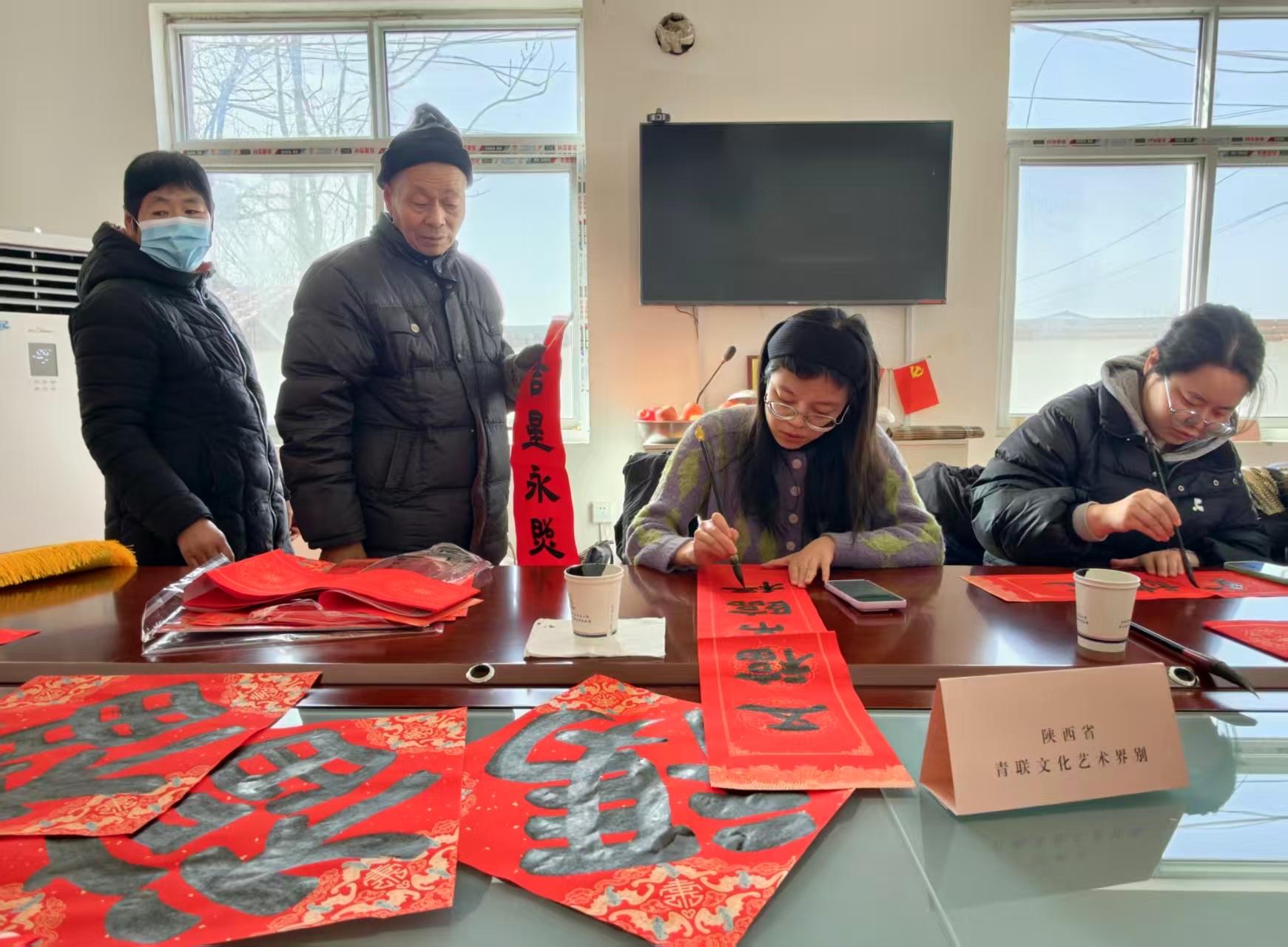 志愿服务项目一:翰墨送福,年味到家——省青年书法家协会、省青联文化艺术界别以及志愿者现场挥毫,将一副副寓意吉祥的春联、一张张喜庆的“福”字送到村民手中。