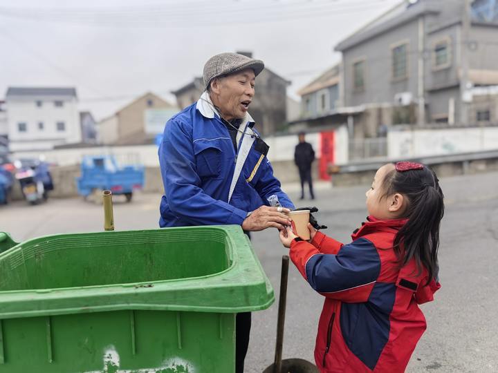 孩子们走出幼儿园,派送热腾腾的腊八粥。