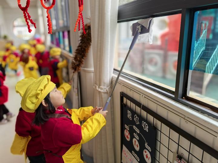 腊月二十八是传统“掸尘日”,孩子们穿戴好围裙、拿起工具,认真打扫教室的每个角落,在劳动中理解“辞旧迎新”的寓意。师生一同写“福”字、剪窗花、贴春联,将幼儿园装点得红火喜庆,年味浓郁。