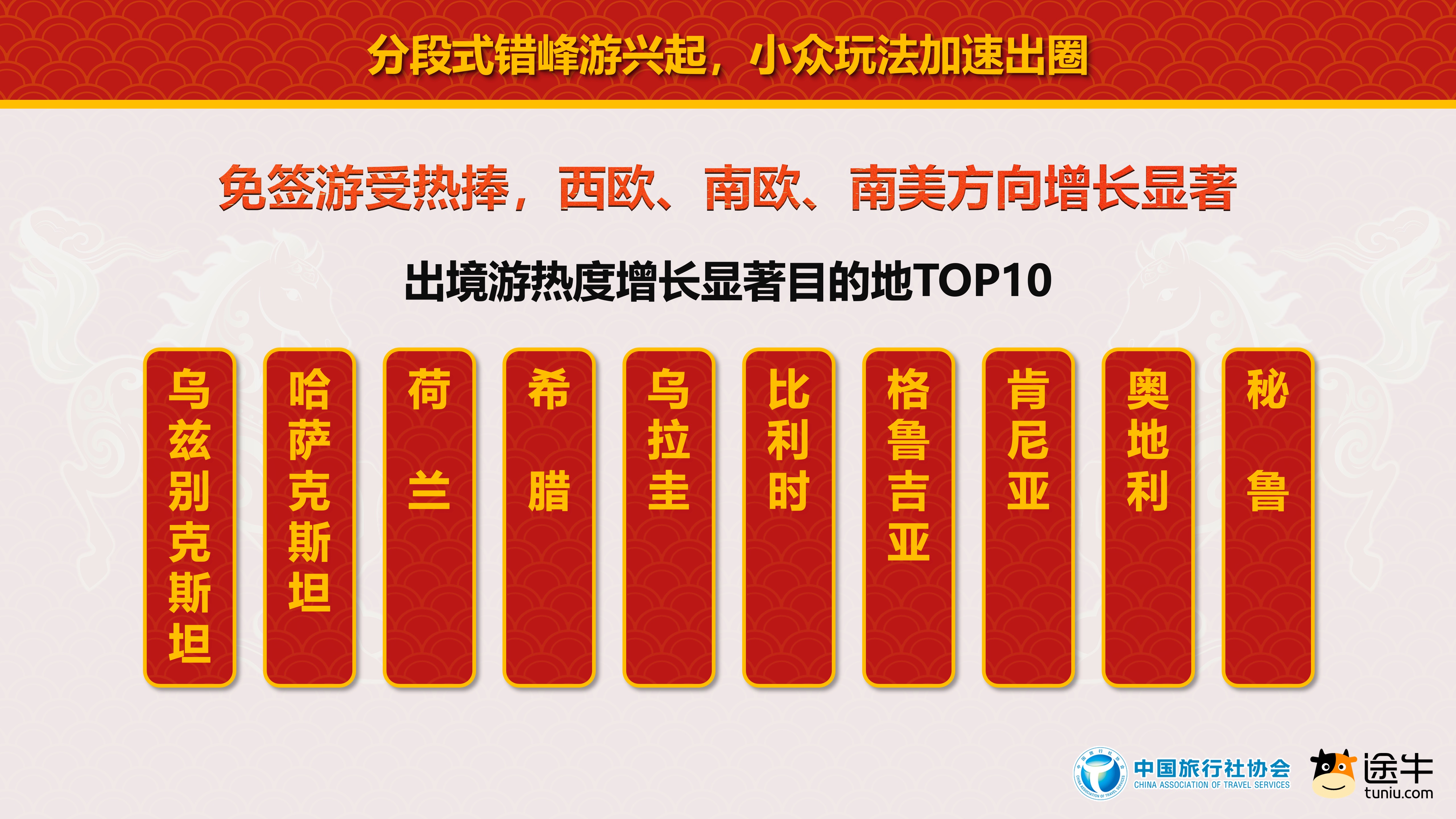 碎片化方面,自驾游、自由行、私家团、定制团、小团游等灵活、个性的打包旅游产品占比增长明显。途牛春节团期打包旅游产品预订中,周边游方向自驾游用户预订出游人次占比超85%,出境短线游方向自由行用户预订出游人次占比过半。