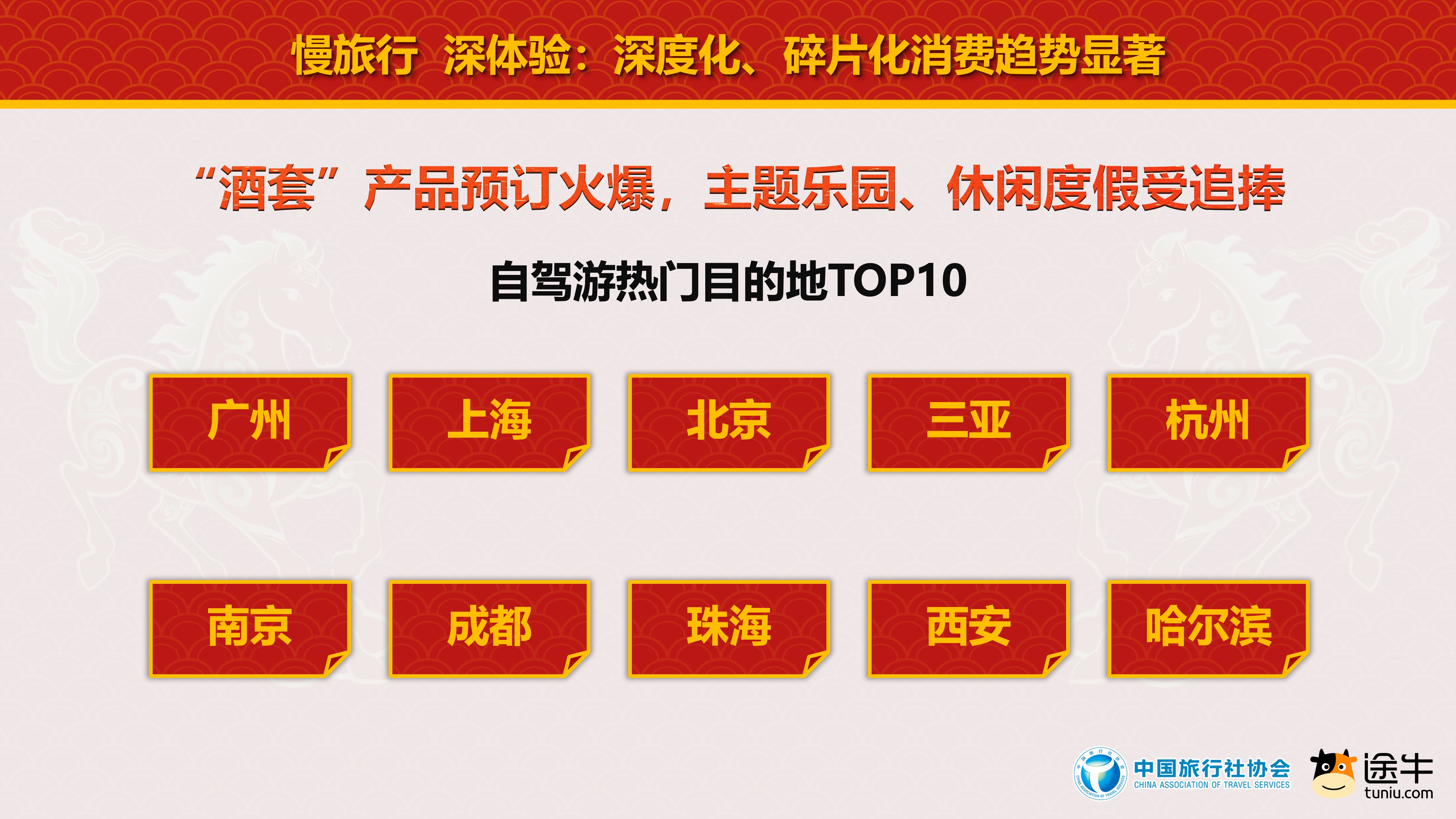 广州、上海、北京、三亚、杭州、南京、成都、珠海、西安、哈尔滨等目的地是途牛自驾游用户的热门选择。上海迪士尼度假区、珠海长隆度假区、广州长隆度假区、北京环球度假区、哈尔滨冰雪大世界等“酒店+主题乐园门票”,以及“酒店+温泉”“酒店+门票”等产品成为更多自驾游用户的选择。