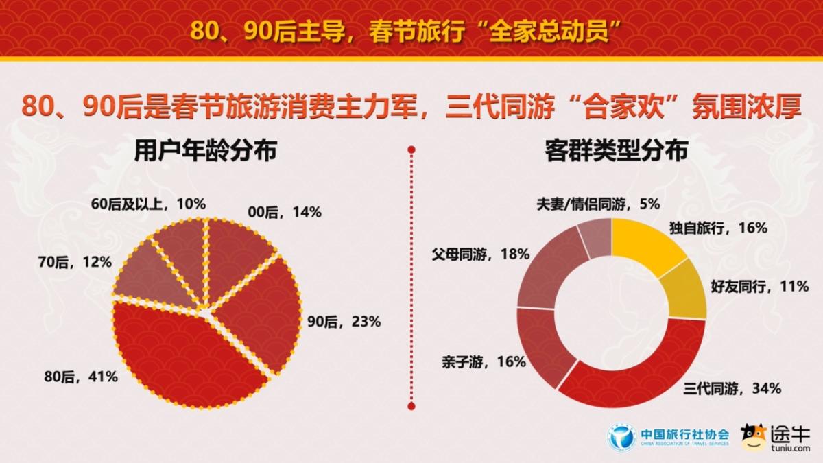 从用户年龄来看,“80、90后”是春节旅游的主力军,预订出游人次占比达64%。“00后”占比稳步增长,预订出游人次占比为14%,逐渐成为旅游市场的重要新生力量。更多途牛用户选择与家人一同出游,其中,三代同游成为更热门的选择,预订出游人次占比为34%,凸显了春节的“合家欢”氛围。