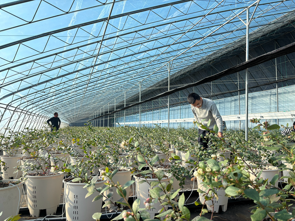 在金井村大棚内,工作人员正在查看蓝莓长势。本报记者 刘义岚 摄