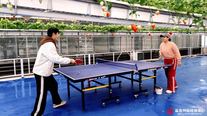 游客在草莓栽培槽下打乒乓球。记者王薇 摄