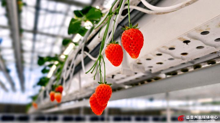 长在架子上的“空中草莓”,你见过吗?1月30日,室外冰天雪地,阜康市九运街镇漫享田园果业产业园(以下简称漫享田园)的智能化大棚内,却是绿意盎然,一条条白色栽培槽排列整齐,鲜红草莓垂落藤蔓,在绿叶掩映下显得鲜嫩欲滴。