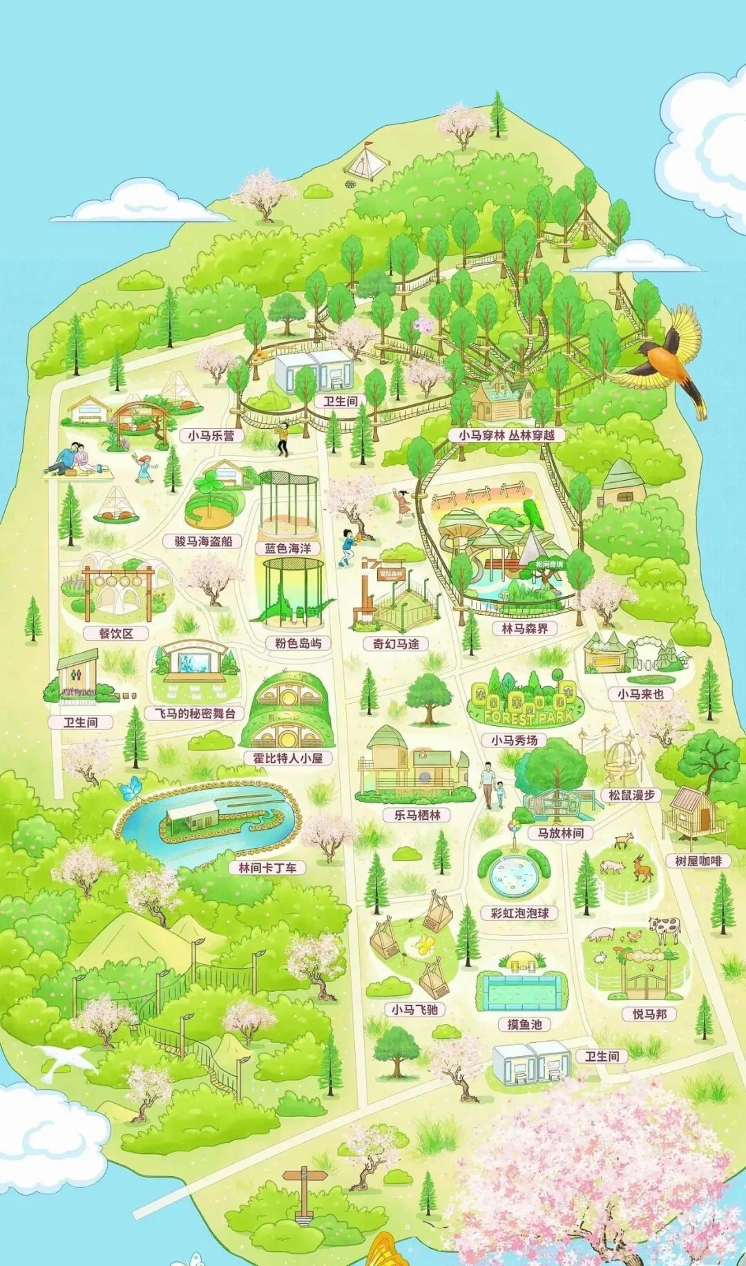 项目规划秘境花园、森林冒险湾、萌宠乐园、松间奇境、冒险森林、森林奇妙屋、欢乐小镇、鹿悦谷、雨林沙丘等多个特色分区,配套皖美舞台、树屋、丛林溜索、泡泡球池、彩虹冒险岛、奇幻树屋等多元休闲娱乐设施,同时设置家长看护区、卫生间、小卖部等完善配套服务。
