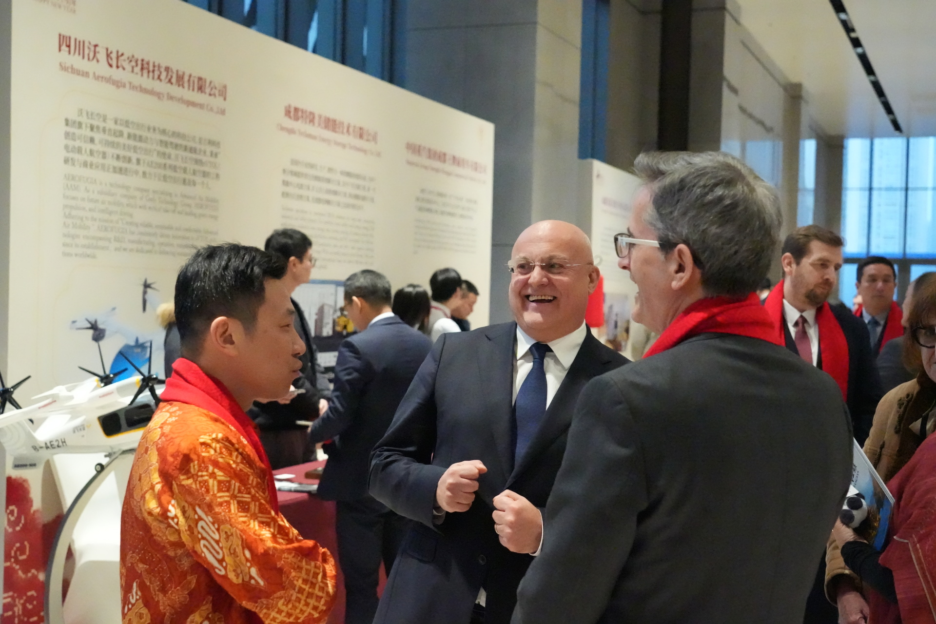 从硬核科技实力的“飞行汽车”“外骨骼机器人”,到具备多种交互功能的人形机器人、AR智能眼镜,再到蜀锦、蓉酒、熊猫定制文创……在新春联谊会现场,一系列融合了前沿科技与浓郁巴蜀特色的“成都造”产品集中亮相,吸引众多领事官员、外宾代表、港澳代表驻足观看、上手体验。