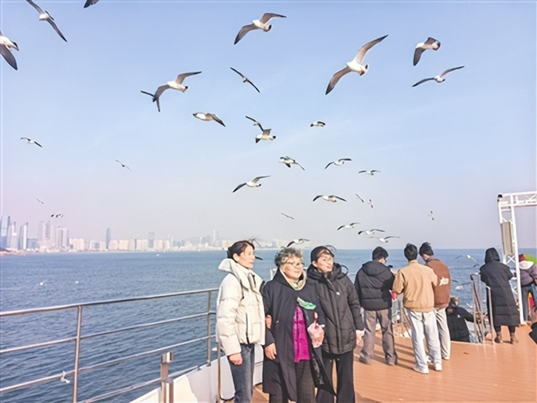 寒冬腊月,胶州湾畔鸥鸣阵阵,千万只红嘴鸥顶着寒风如约而至。如今,“坐游船、喂海鸥”已成为青岛市民休闲娱乐、外地游客打卡观光的首选项目,每周必来的本地家庭、慕名而至的远方宾客,都在碧海鸥影间,感受着岛城的冬日温情与文旅活力。