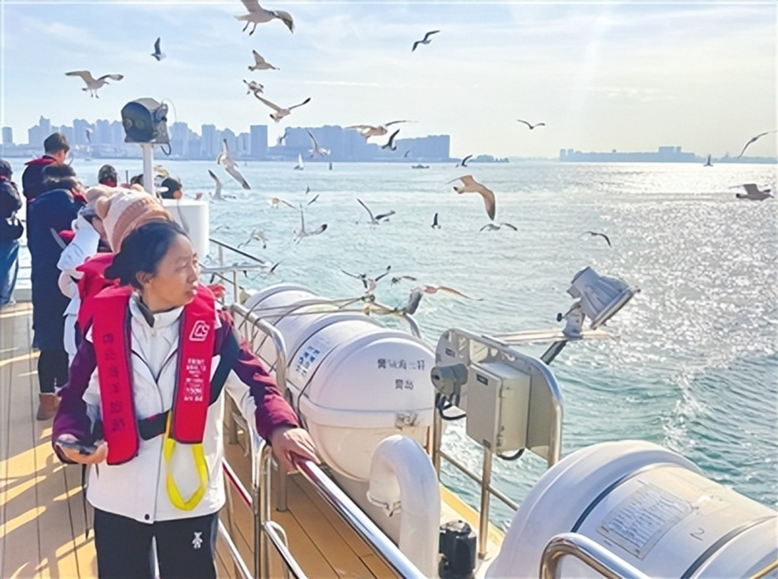 “70元的成人票,能看大桥、喂海鸥、赏海景,几杯奶茶的钱,就能体验一场海上之旅,性价比也太高了!”大学生小李,和同学一起打卡了海上穿越大桥环游航线,直呼“超出预期”。“上午带孩子去科技馆逛一逛,下午乘船体验海上穿越大桥,一天的行程充实又合理,孩子玩得特别开心。”来自江苏的游客赵先生一家,已是第二次来青岛旅游,他告诉记者,往年冬天来青岛,只能逛老街、吃海鲜,亲海体验几乎为零,“这次听说轮渡推出了新航线,特意过来打卡,船上很暖和,孩子喂海鸥喂得不亦乐乎,终于能真正亲近青岛的海了。”
