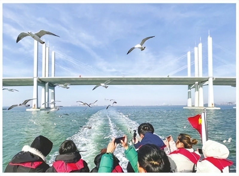游船起航后朝着大桥方向驶去,大概40分钟后胶州湾大桥的身影逐渐清晰。“快看,大桥就在头顶了!”随着游船缓缓驶向胶州湾大桥正下方,船舱里响起游客的惊叹声。大家纷纷涌向甲板,仰头望去,混凝土桥体在头顶绵延,斜拉索如银色琴弦般整齐排列。环顾四周,冬季的胶州湾,有着别样的美,海水能见度更高,空气通透,远处高楼和近处大桥的轮廓格外清晰,成群的海鸥聚集在船后,追随轮船轮机搅动扬起的水花。“很多人觉得冬天不适合海上游览,其实冬天的海更有味道。”杨师傅自2024年航线运营开始就在船上工作了,他说,冬季海鸥群更加集中,船上会为游客提供专门的海鸥食,抛撒出去,成群的海鸥便紧随船尾,时而俯冲啄食,时而盘旋鸣叫,人与海、与自然的亲密互动,让这段海上旅程更有趣。