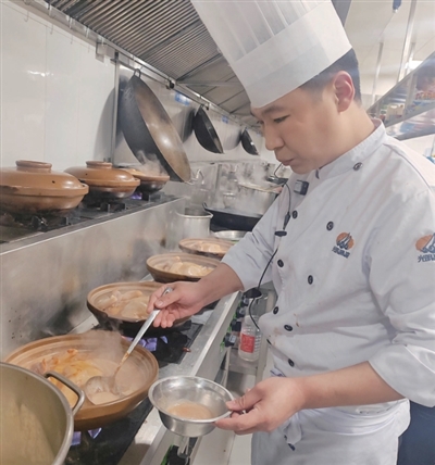 夜幕降临,饭店大厅里觥筹交错,后厨炉火正旺。刘硕和十几位同事在各自岗位上忙碌,锅铲碰撞声、油烟机轰鸣声、传菜员的吆喝声交织在一起,构成独特的“交响曲”。“忙的时候,手不能停,脑子也不能停。”刘硕说,“尽管今年除夕又不能陪家人吃团圆饭,但能为这么多家庭烹制年味,挺开心。顾客的笑容,就是对我们最大的认可和奖励。”