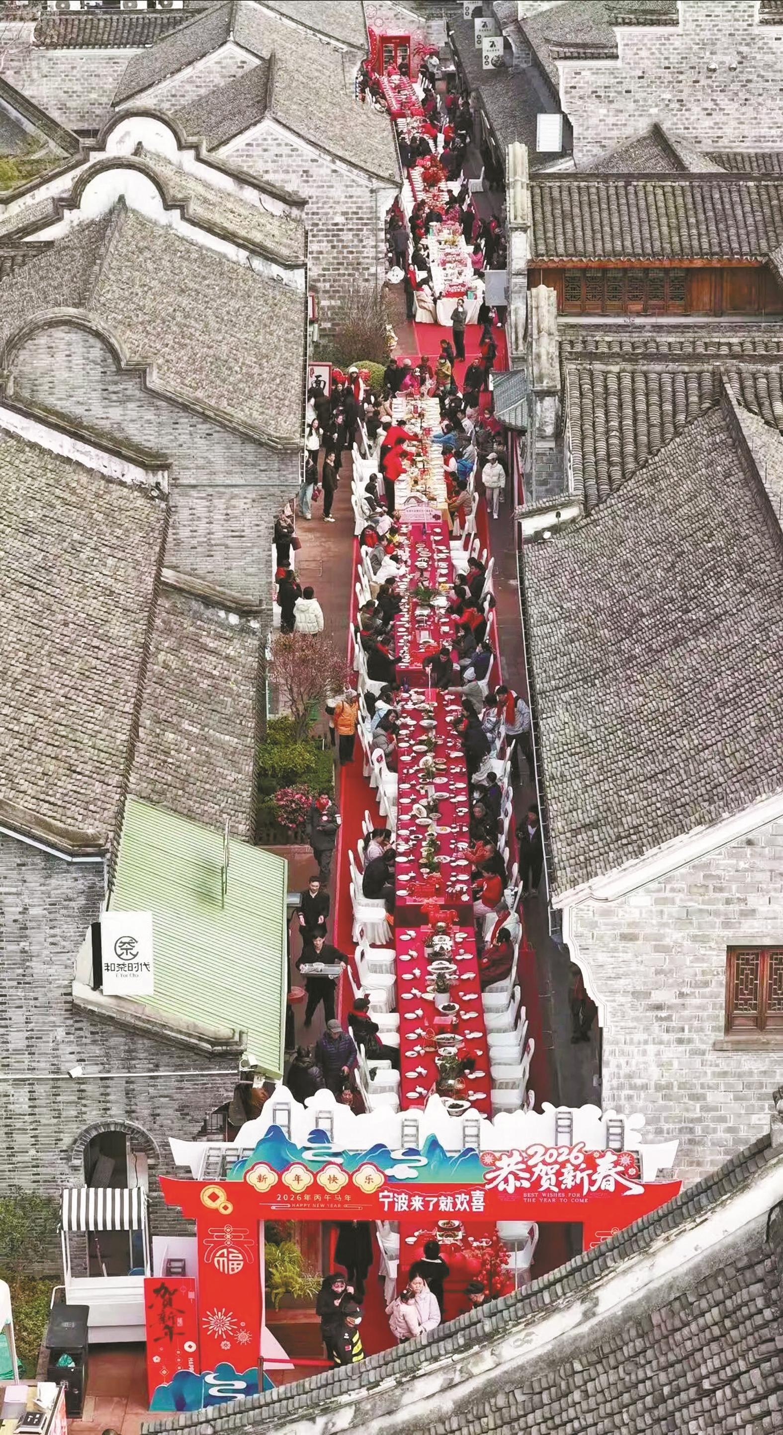 长桌宴,是流动的中国年味;宁波地,是丰饶的山海粮仓。今年,在南塘老街举办长桌宴已迈入第三届。今日的南塘河烟水含情、街巷张灯结彩,“上菜喽!”锣声敲响,一条长达202.6米的“新春长桌”沿南塘河畔铺展,汇聚“甬菜百碗”数百道佳肴,宁式点心、海鲜礼包、文创好物齐聚的文旅市集同步迎客,梅山舞狮、奉化布龙、象山鱼灯等非遗展演轮番登场,烟火气与文化韵在此交织。