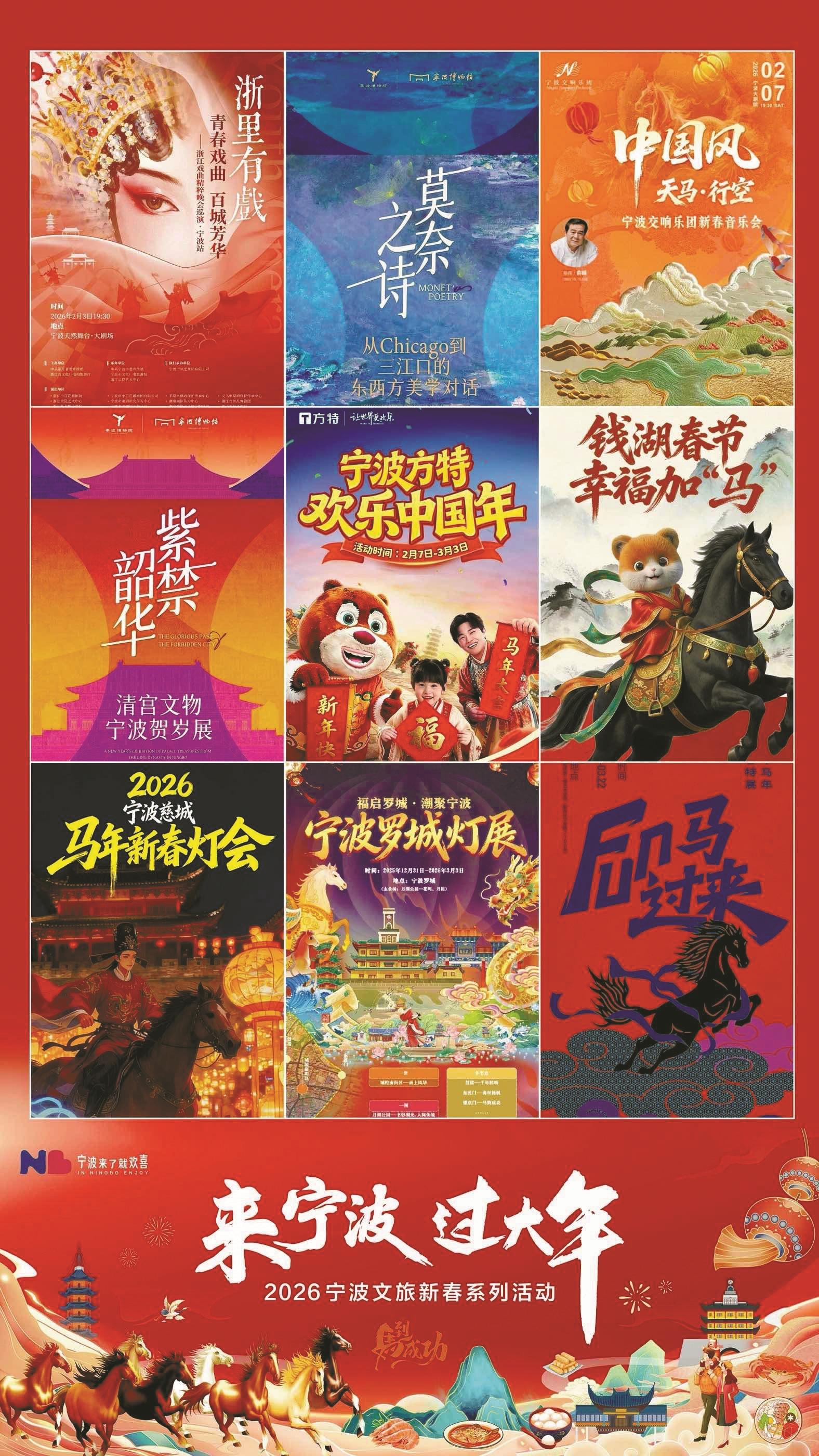 活动分为“跃马飞歌·赏好戏”“鲜衣怒马·逛花灯”“一马当先·探古今”“马不停蹄·品美食”“天马行空·览山海”“走马观花·赶大集”“马上放‘价’·惠万家”“马到成功·大联动”等八大板块,绘就一幅流光溢彩的“八骏图”,诚邀四海宾朋共赴甬城,过一个主客共享的幸福年。