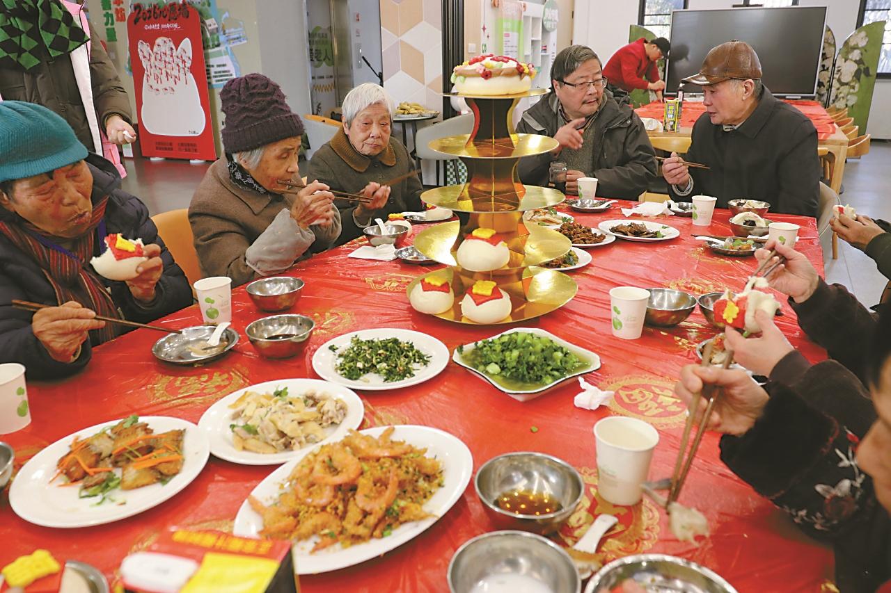 2月9日,宁波市江北区文教街道双东坊社区活动中心内张灯结彩、暖意融融,10余位社区独居孤寡老人齐聚一堂,在志愿者的陪伴下共享暖心年夜饭。
