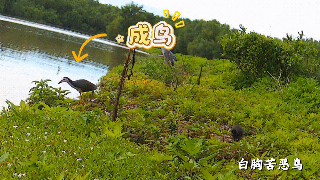 红外相机精准定格白胸苦恶鸟一家的温情瞬间。成鸟化身尽职的“觅食教练”,在岸边稳步探寻美食,身后的雏鸟们屁颠屁颠地紧紧贴住家长,活脱脱像怕掉队的小跟屁虫。