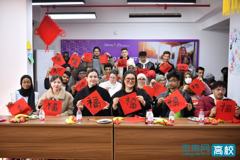 活动现场,张荣军亲笔示范毛笔“福”字写法,亲手指导学生执笔、运墨,耐心解答同学们的疑问、亲切交流书写心得,让同学们在亲身实践中真切感受中国书法的独特魅力。国际教育学院教师同步讲解“福”字的历史起源和文化内涵,详细阐释了“五福临门”所代表的美好寓意,以及贴“福”字、写“福”字等民俗背后寄托的吉祥祈愿,师生互动气氛热烈。
