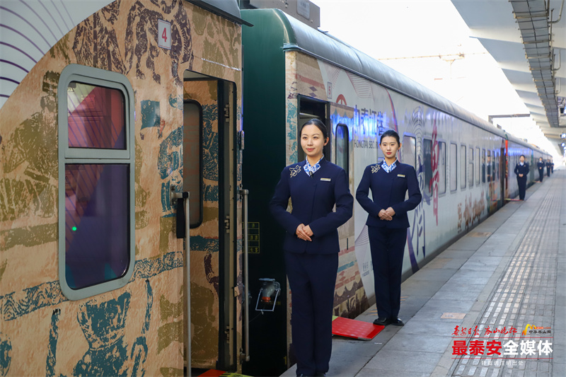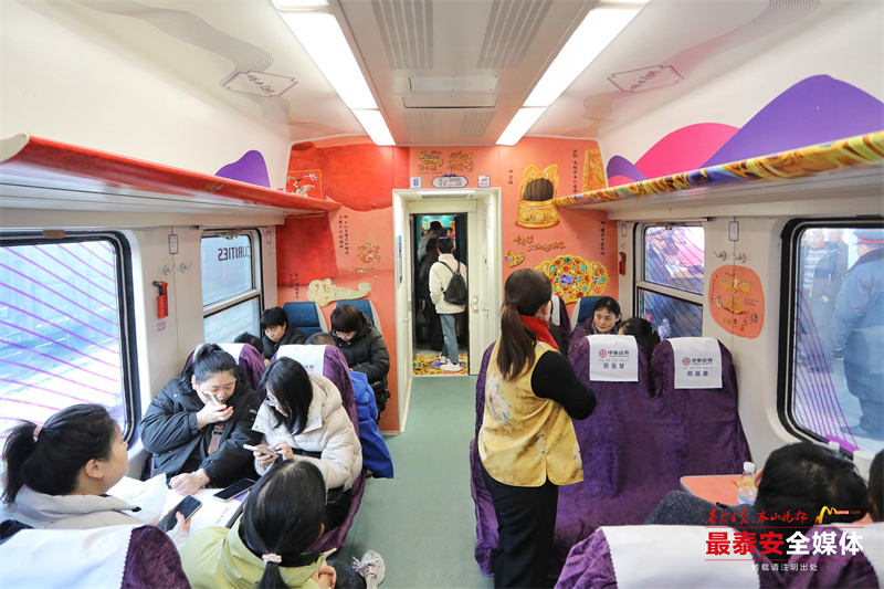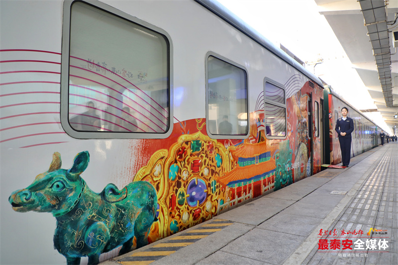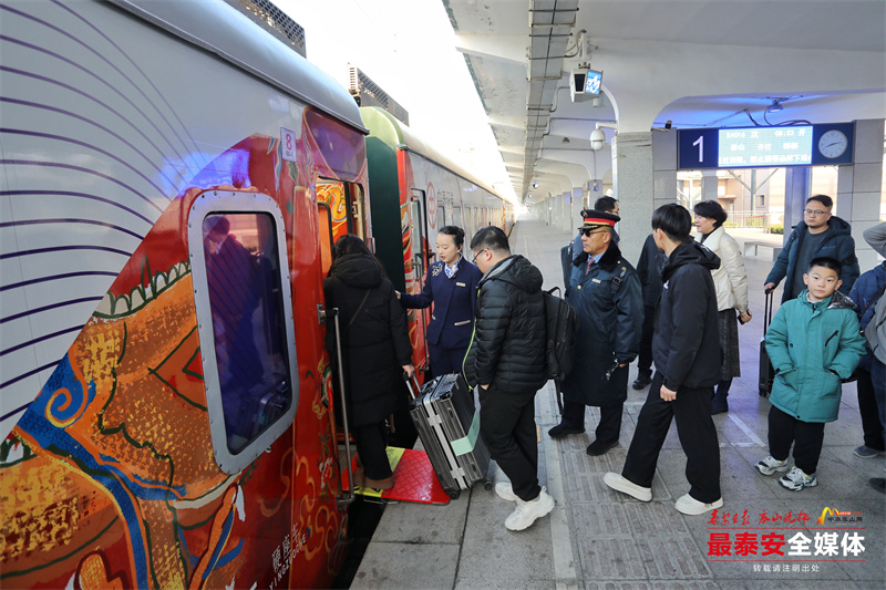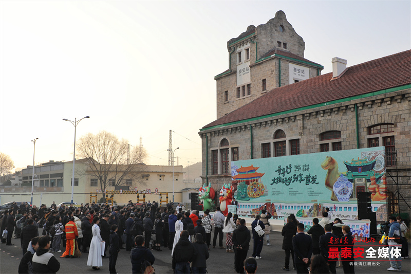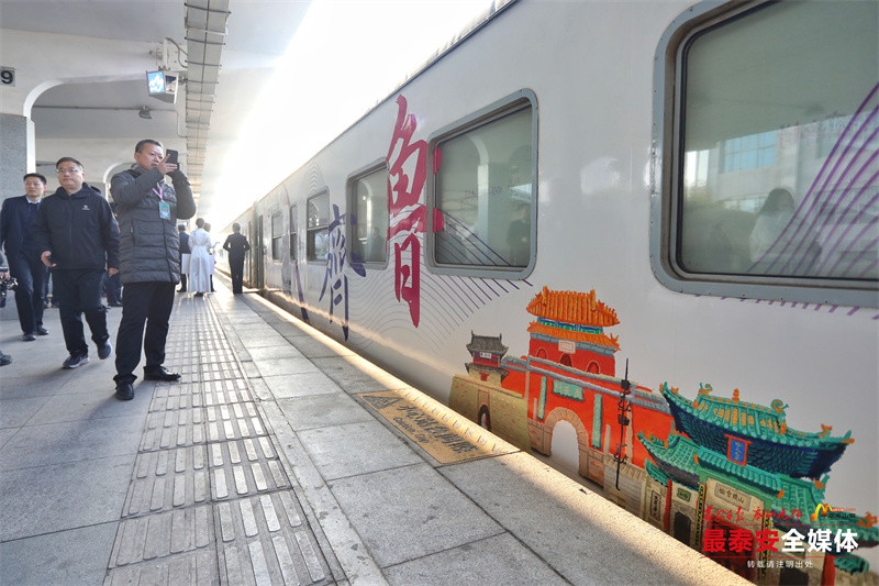2月14日上午,“好客山东·齐鲁1号”文物研学主题旅游列车首发活动在泰安文旅驿站北广场举行,这是“好客山东·齐鲁1号”品牌体系下的首个跨省文物研学主题旅游列车。
