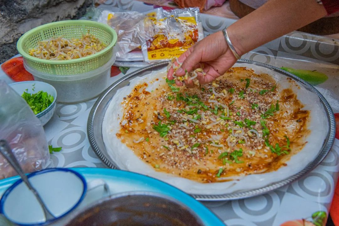 源自缅甸的特色街头小吃,师傅将发酵面饼甩至薄如蝉翼,再煎至金黄酥脆,淋上浓稠炼乳,可搭配香蕉、榴莲等水果馅料,外酥里嫩、香甜可口,带着淡淡的椰香与炼乳醇厚,一口解锁边境风味。