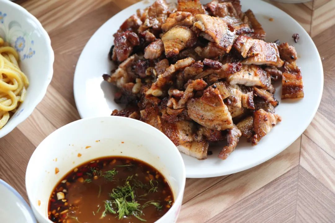 滋滋冒油的五花肉蘸上腾冲特有的腌菜膏,焦香带上酸味,越吃越想吃!