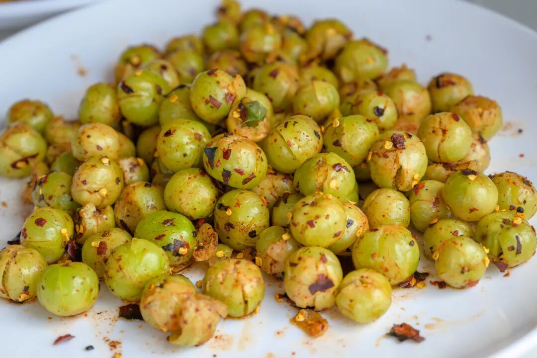 凉拌水果选用新鲜水果(青芒、木瓜、李子、菠萝等),搭配糊辣椒面、白糖、小米椒等作料拌匀,酸甜开胃、脆嫩爽口,层次丰富,解腻又解乏。