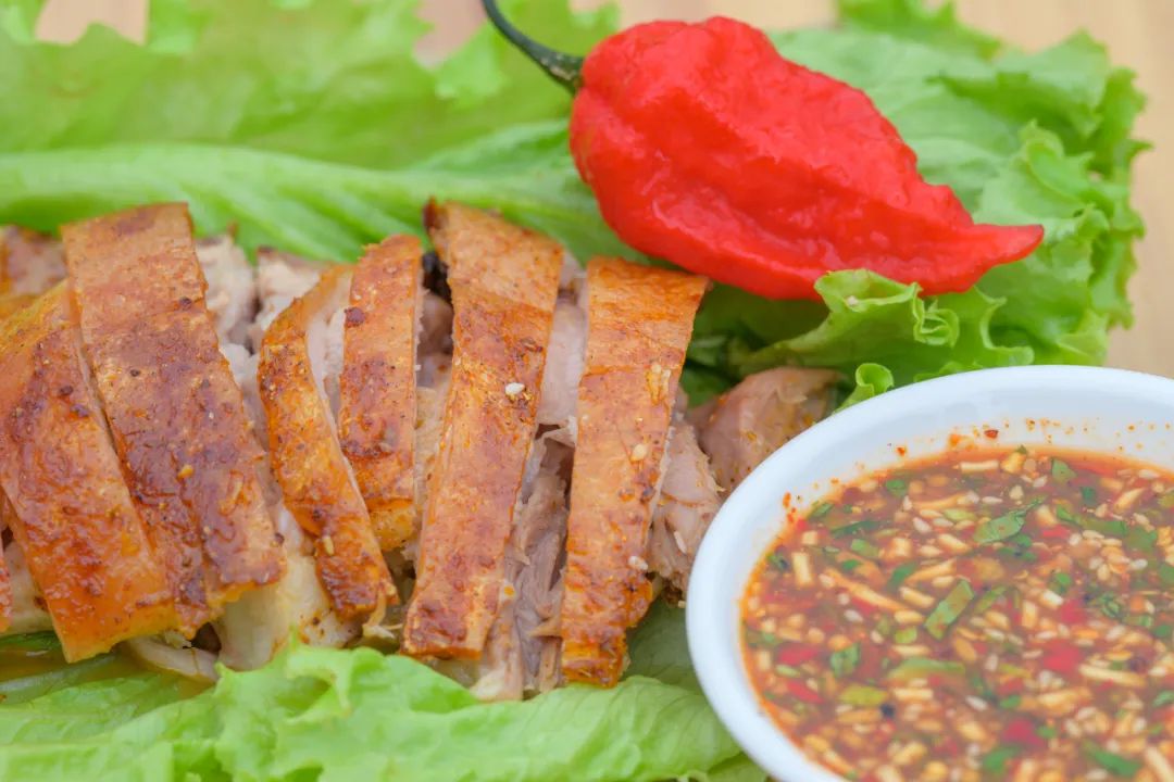 小耳朵猪表皮酥脆起泡似鸡皮纹、肥肉透明却不腻口、瘦肉鲜嫩但丝丝分明,色泽金黄,香气袭人。