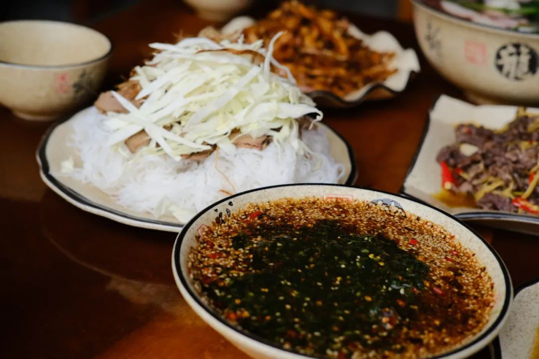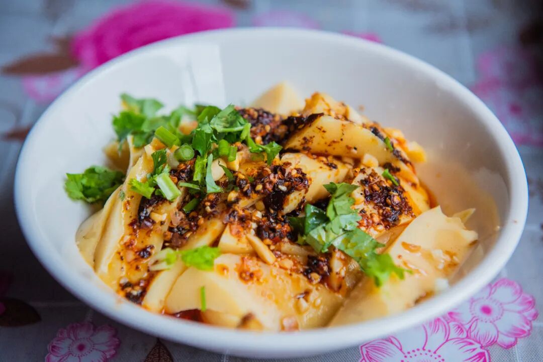 片状的、丝状的凉粉放入作料,酥脆的苤菜根咀嚼入口,酥脆焦香,醇香的米醋夹着芝麻油、草果油、辣椒油、蒜汁儿一起入口,清凉而爽滑,酸辣开胃。