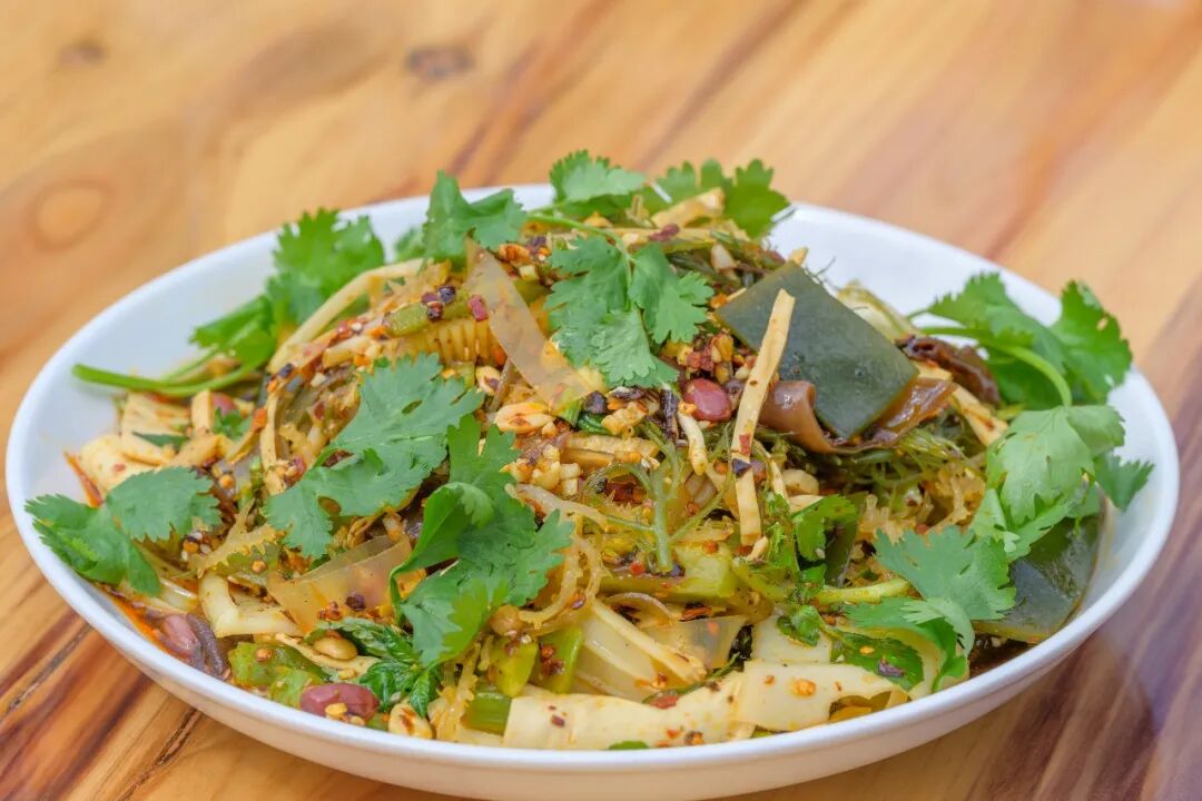 腾冲街头常见的清爽小吃,选用本地新鲜时蔬(莴笋、黄瓜、海带、豆芽、蕨菜等),搭配自制酸水、小米辣、蒜末、香菜、秘制辣椒油等调料拌匀,口感脆嫩爽口、酸辣开胃,不油不腻,自带山野清香。