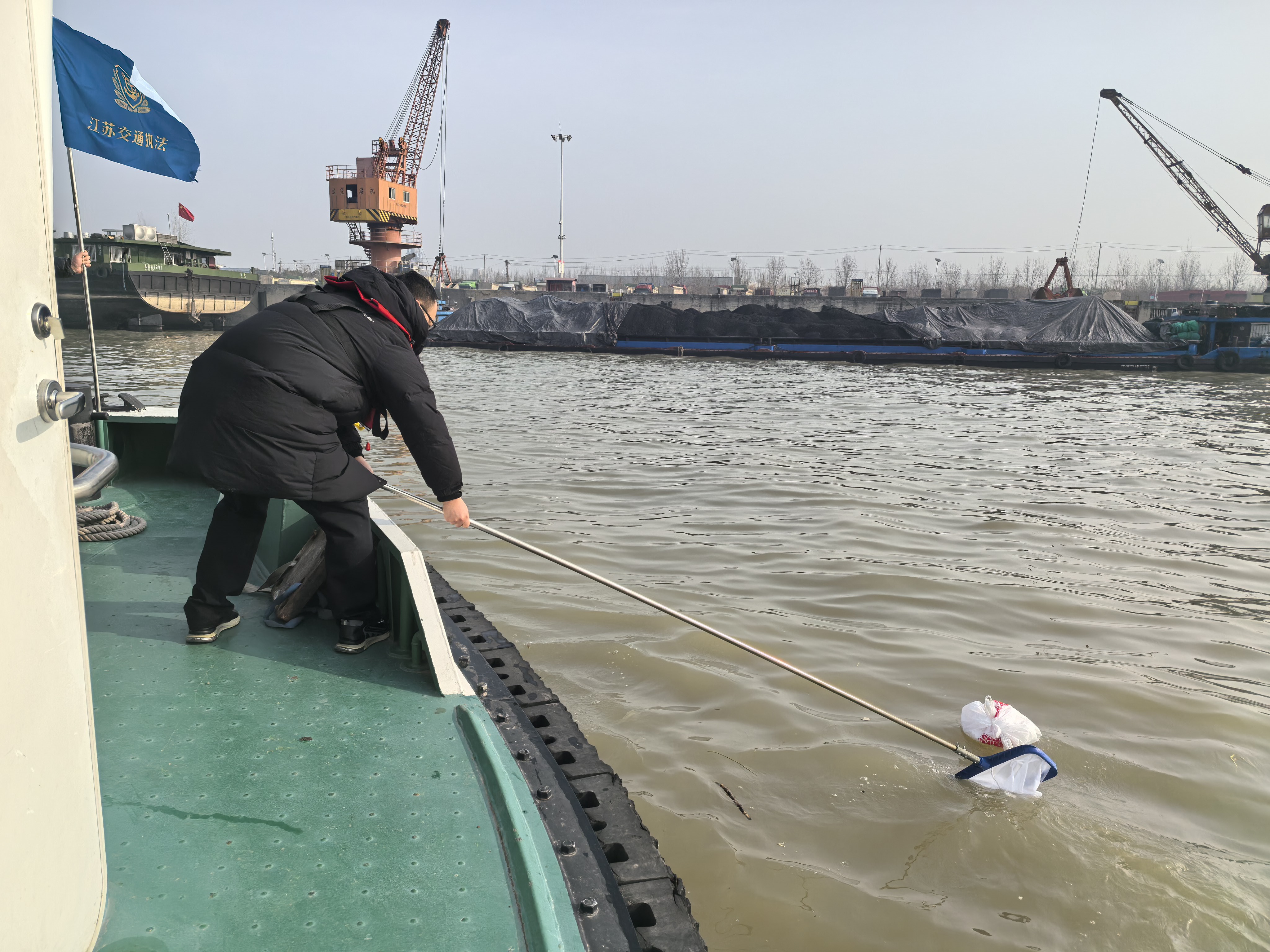 共同守护运河清,党员行动践初心。2月21日,泗阳船闸管理所党员先锋队再次出发,开展“青清运河”水污染治理行动。队员们走访东港作业区船舶,征集船员关于水污染防治的意见建议,协助回收生活垃圾,发放环保宣传资料,并详细介绍智能垃圾回收装置使用方法。与此同时,志愿者利用巡航间隙,手持捞网清理沿岸水域漂浮物。大家不畏寒冷、不嫌脏累,以实际行动守护大运河生态底色。