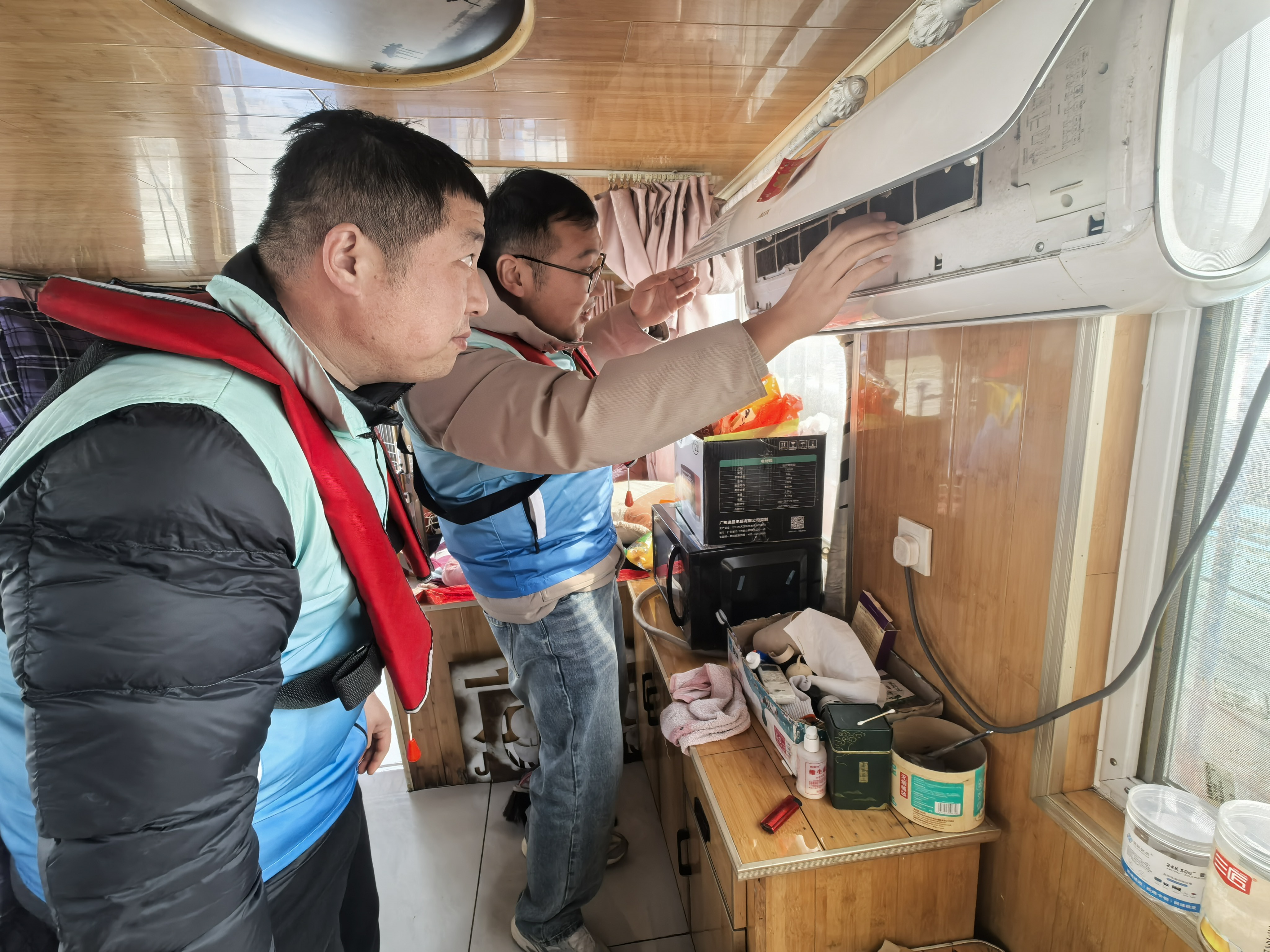 义务检修送上船,平安护航暖人心。2月20日大年初四,泗阳船闸管理所党员志愿者一早便乘航政艇抵达下游东港码头,走访留守船舶。在“鲁济宁”货船上,志愿者开展“苏心春运·义务检修”活动。来自养护的志愿者对船舶航行设备、生活电器等进行检查维护,发放冬季安全宣传资料,细致讲解电气保养、消防防滑及防寒注意事项,助力船员筑牢节日安全防线。