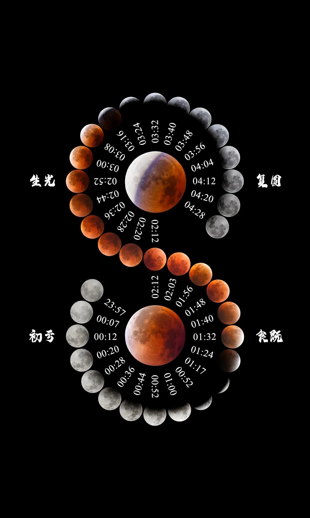 据紫金山天文台预报,3月3日月全食全程分为7个阶段,建议提前就位等候: