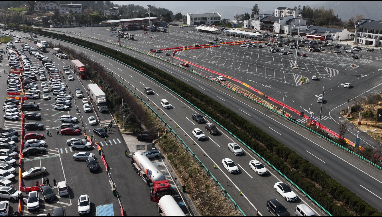 正月初三,工作人员完成锥桶布设、导向牌安装、可移动栏杆设置等全线路施工;正月初四,“潮汐车道”正式投用。通过临时导流,开放下穿通道连接对向服务区,实现车位、厕所、加油、充电资源的动态调配。现场设置多块临时指示牌,并有专人进行引导,同步联动导航平台发布通行提示,确保车辆“看得懂、走得顺”。