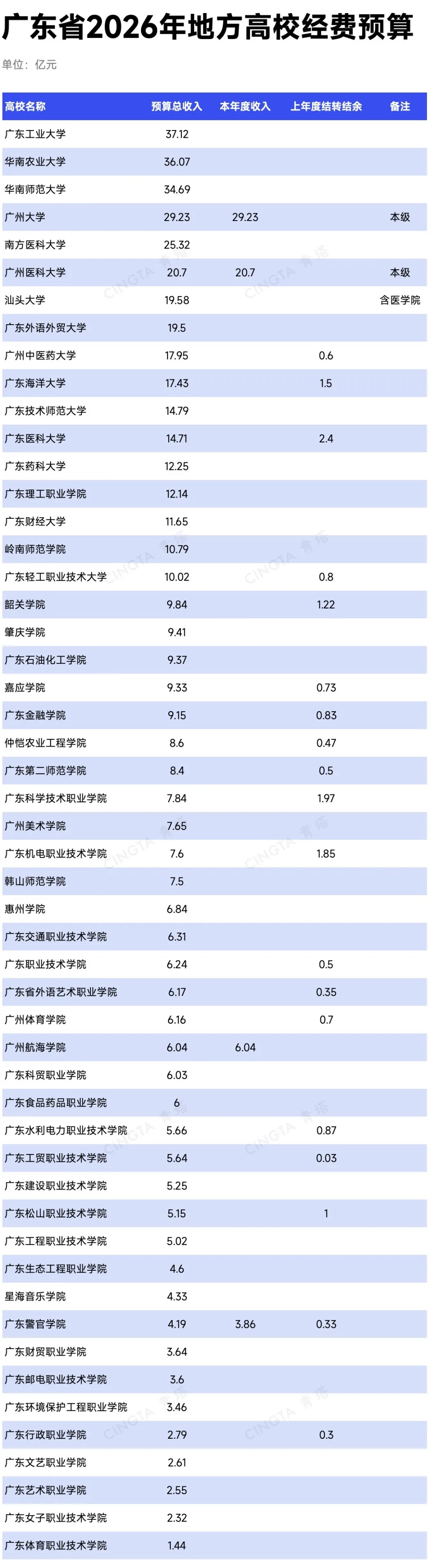 预算总收入超20亿元的高校还有广州大学(29.23亿元)、南方医科大学(25.32亿元)、广州医科大学(20.7亿元)。