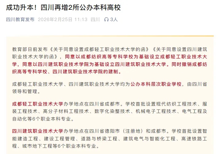 根据四川教育发布官微信息,教育部日前发布《关于同意设置成都轻工职业技术大学的函》《关于同意设置四川建筑职业技术大学的函》,同意以成都纺织高等专科学校为基础设立成都轻工职业技术大学,同意以四川建筑职业技术学院为基础设立四川建筑职业技术大学。同时撤销成都纺织高等专科学校、四川建筑职业技术学院的建制。