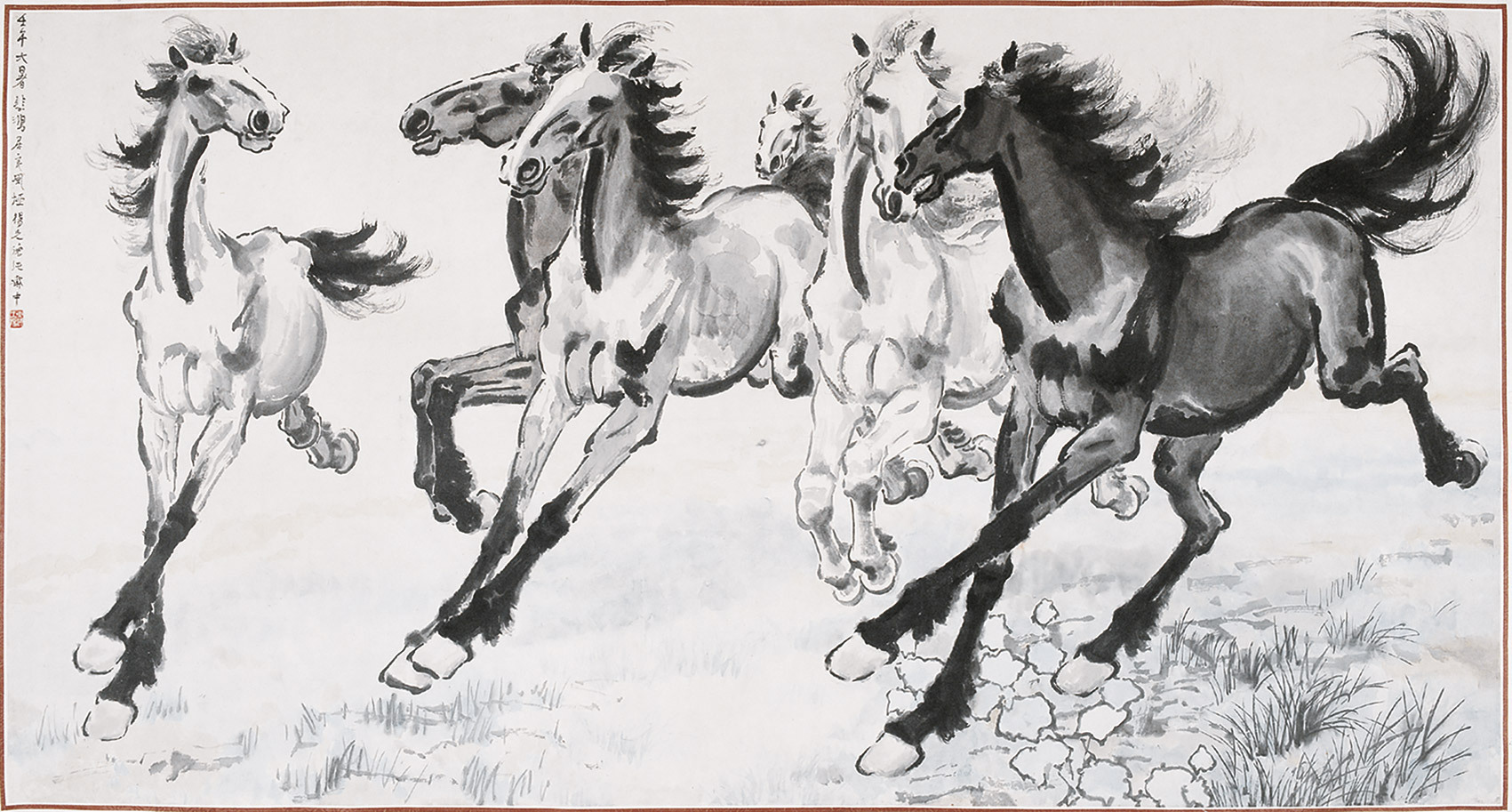 抗日战争年代,父亲笔下的马身形瘦劲、充满张力,或驰骋无羁,或迎风长嘶,寄托了深厚的民族情感。1935年,他用一幅《奔马图》感叹“此去天涯将焉托,伤心竞爽亦徒然”,满溢忧国忧民之情。1941年,他创作的《奔马图》中,骏马筋骨强健、昂首奋蹄,两条前腿径直向观众伸出,不管你站在画前的任何角度,都似迎面奔来,题跋“辛巳八月十日第二次长沙会战,忧心如焚,或者仍有前次之结果之。企予望之。”这幅画被称为“长沙会战之马”,成为最负盛名的奔马作品之一。《六骏图》则创作于1942年,画中六匹骏马姿态各异、奔腾不息,象征着中华民族不屈不挠、勇往直前的精神,也寄托了父亲对国家独立强盛的深切期盼。