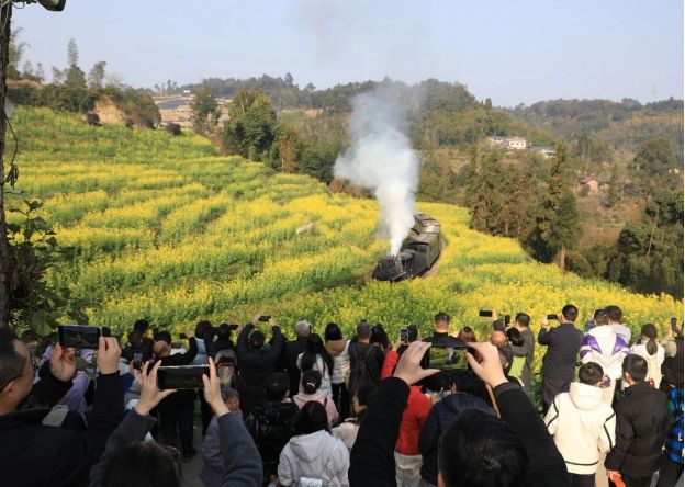 沿着婀娜秀丽的犍为芭石铁路,成片的山坡上,层层叠叠的油菜花正在盛放,形成了一幅天然的春日画卷。山坡上站满了大批扛着“长枪短炮”的游客,等待古朴的小火车从山洞钻出来,一头扎进壮美的花海。“这次回老家过年,听说家乡有个被《中国国家地理》杂志评选的‘最美100个观景·拍摄点’,就来看看,”游客刘瑶连连按下快门,兴奋地告诉记者,“之前听家人说油菜花要3月开放,还有点遗憾,没想到已经这么壮观了,真是不虚此行!”