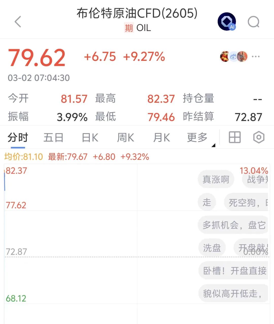 3月2日,布伦特原油开盘暴涨13%,至每桶82美元,截至发稿涨9.27%报79.62美元/桶。WTI原油跃升至75.33美元/桶。