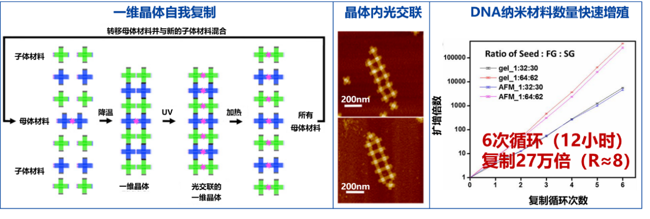 建立了生物高分子晶体内自我复制新方法,突破了自我复制“一生二”的速度限制,实现了DNA纳米材料的高效制备。