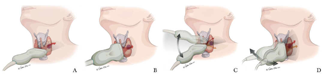 1日本内分泌外科医师学会(JAES)指南[21]:年龄>60岁;穿刺确诊为PTC并排除侵袭性亚型;结节直径≤1.0 cm;无临床可见的淋巴结转移(N0)及远处转移(M0);肿瘤与气管、喉返神经之间存在安全边界(图1);无其他需手术治疗的甲状腺/甲状旁腺疾病(推荐强度:1B)。