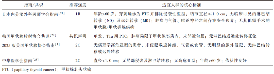 3中华医学会指南[23]:肿瘤直径<1.0 cm;无局部侵袭及颈部淋巴结转移;穿刺未见高危PTC亚型;年龄>60岁;患者依从性良好(推荐强度:3C),详见表2。