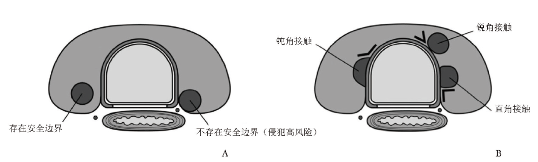 图1 肿瘤与喉返神经(A)和气管(B)的解剖关系示意图[21]