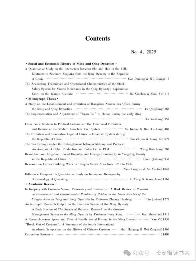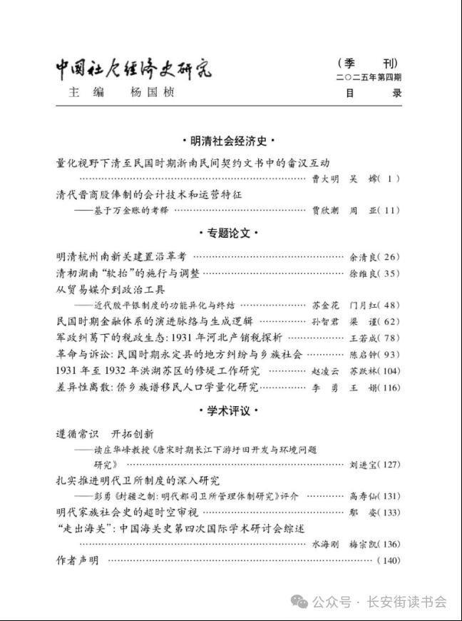 孙智君、梁谨在《中国社会经济史研究》2025年第4期撰文《民国时期金融体系的演进脉络与生成逻辑》指出,民国时期,中国金融体系加速变革和发展,其演变呈现四大特征:金融组织由传统向现代过渡,金融结构由地方割裂走向中央集权,对外关系从依附列强转向自主探索,金融技术由局部引进到本土化建设。其内在逻辑是一个由“路径依赖与外部冲击交织、政府与市场博弈、国际形势与国家能力互动、技术能力支撑与制约”构成的复合机制。该文构建的“市场发育—政府构建—外部冲击—技术能力”四维互动框架旨在揭示,后发国家的金融现代化困境源于系统内部多重张力的非均衡发展,而非单一因素所致。该文的边际贡献在于将技术能力作为关键调节变量纳入分析,并指出民国金融的自主性困境本质上是国家能力建设滞后与技术依附性共同导致的系统性结果。