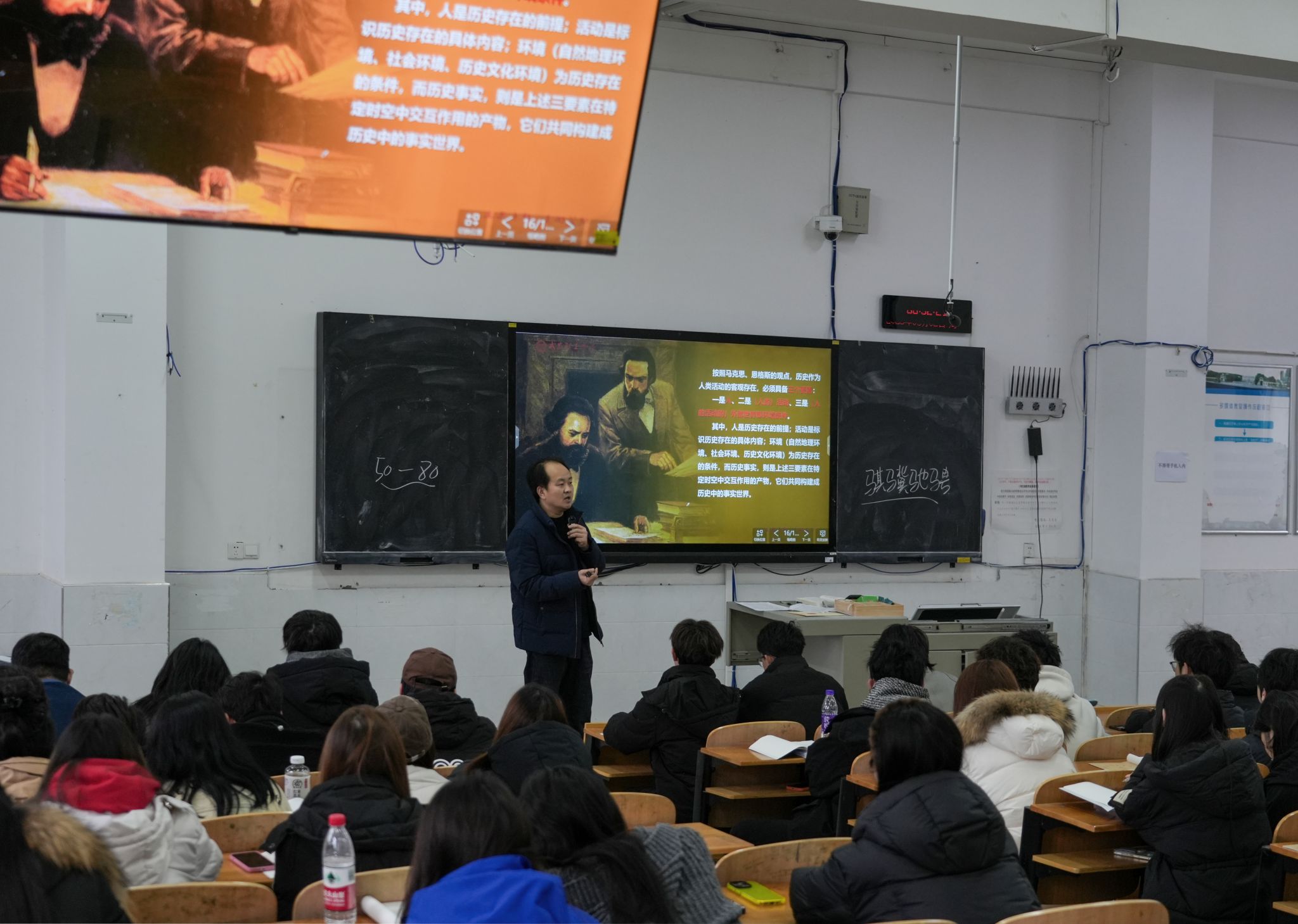 课堂上,侯亮荣老师围绕课程导言展开教学,从教师简介、课程学习要求、课堂规范、考核方式,到中国近现代史的学习意义、历史分期、科学历史观树立等核心内容进行系统讲解。课程设计条理清晰,既明确了“三率”“三带”“五会”的课堂学习要求与考勤、作业等具体考核标准,又立足思政课核心定位,深入阐释了学习中国近现代史对于明辨历史规律、增强民族认同、理解“四个选择”历史必然性的重要意义,将历史知识传授与思想政治引领有机融合,课堂节奏紧凑,教学环节完整,充分调动了学生的课堂注意力与参与度。